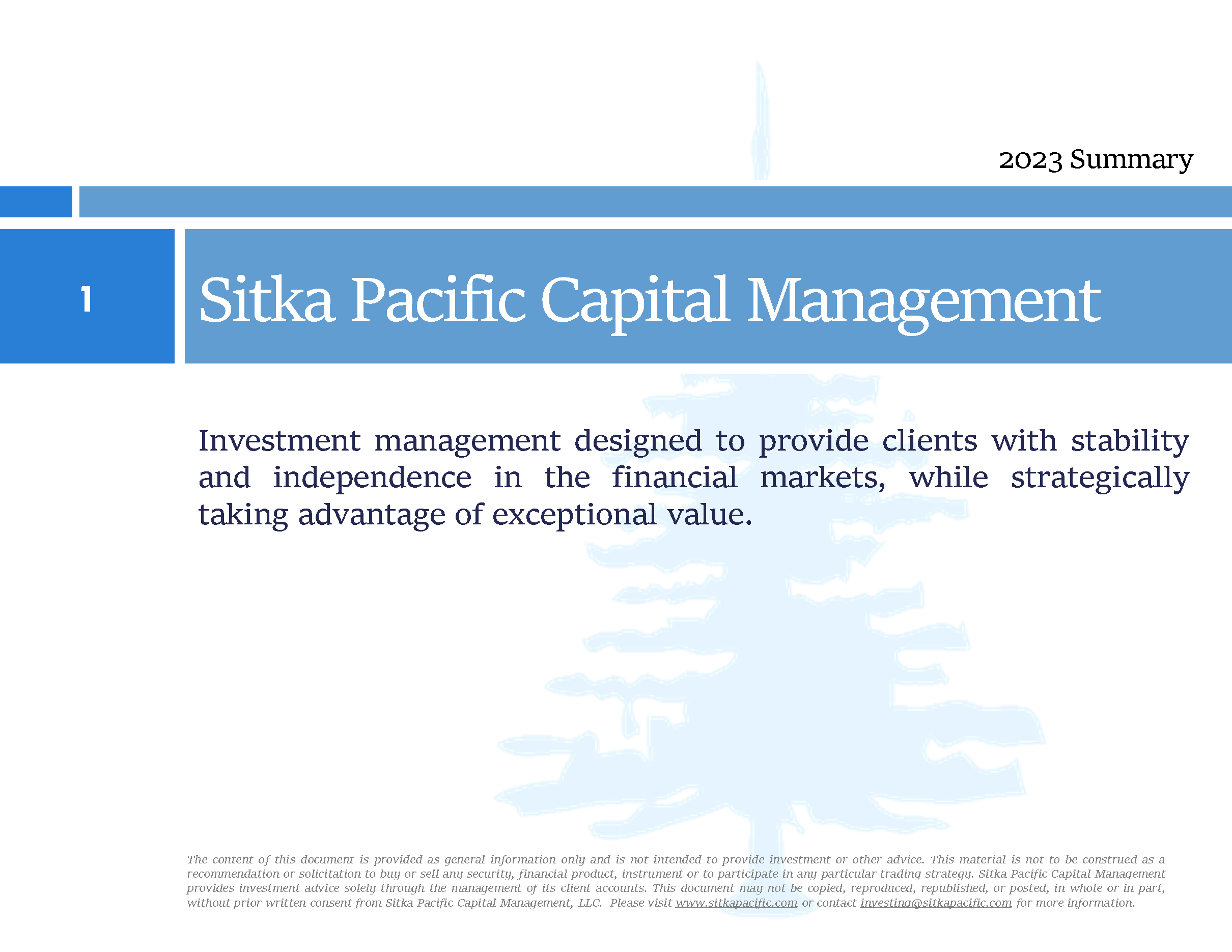 Before investing, we will discuss your goals and risk tolerances with you to see if a separately managed account at Sitka Pacific would be a good fit. To contact us for a free consultation, visit Getting Started.